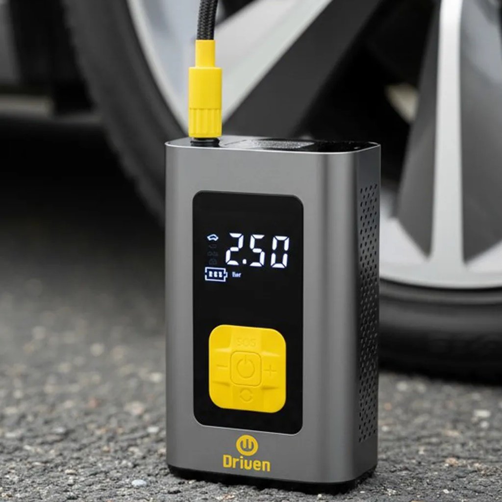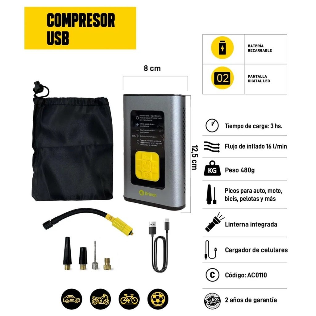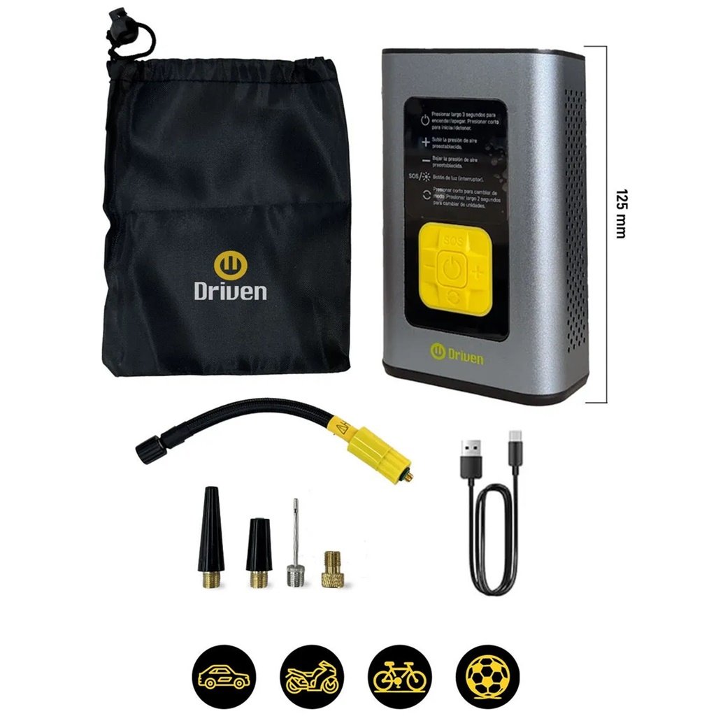 Con el Compresor de Aire Portátil y Cargador USB Driven, llevás potencia, tecnología y comodidad en la palma de tu mano.