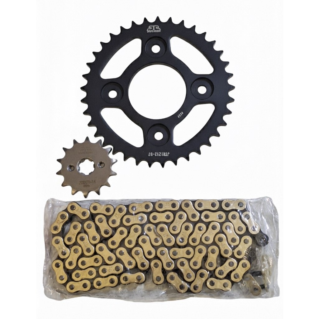 Kit de transmisión marca JT para Wave 110 S. Incluye corona de 37 dientes, piñón de 14 dientes y cadena 428H x 108 G&B (Gold & Black). Ideal para mantener el rendimiento original, con excelente durabilidad y un estilo distintivo.