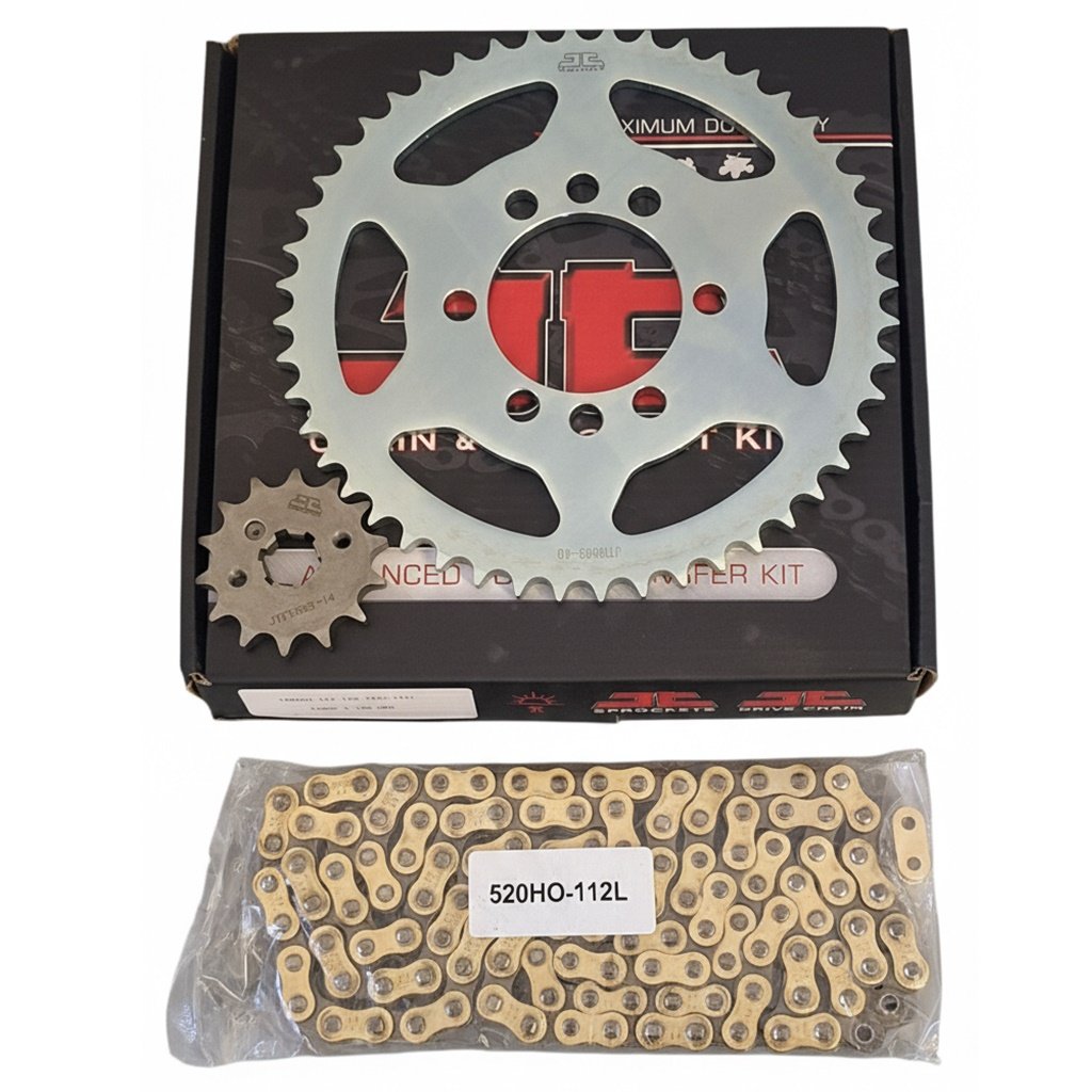 Kit de transmisión marca JT para Yamaha XTZ 125. Incluye corona de 48 dientes, piñón de 14 dientes y cadena 428H x 122 G&B (Gold & Black). Ideal para mantener el rendimiento original, con excelente durabilidad y un estilo distintivo.
