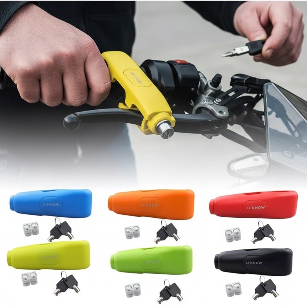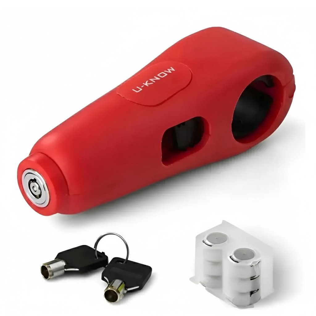 El traba de freno-puño UKNOW es una excelente opción para asegurar tu moto de forma visible, rápida y efectiva. Bloquea el freno delantero al mismo tiempo que activa una alarma sonora integrada, disuadiendo cualquier intento de robo. (CONSULTAR DISPONIBILIDAD DE COLORES)